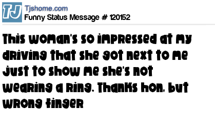 X says This woman's so impressed at my driving that she got next to me just to show me she's not wearing a ring. Thanks hon, but wrong finger