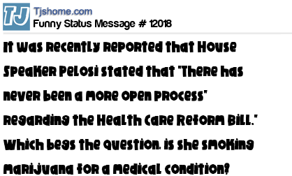 X It was recently reported that House Speaker Pelosi stated that "There has never been a more open process" regarding the Health Care Reform Bill." Which begs the question, is she smoking marijuana for a medical condition?