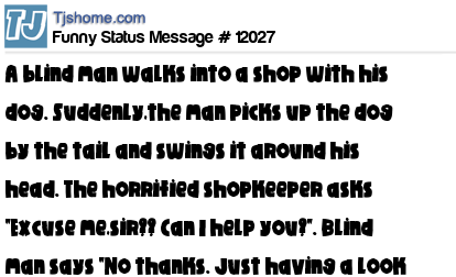 X A blind man walks into a shop with his dog. Suddenly,the man picks up the dog by the tail and swings it around his head. The horrified shopkeeper asks "Excuse me,sir?? Can I help you?". Blind man says "No thanks. Just having a look around."