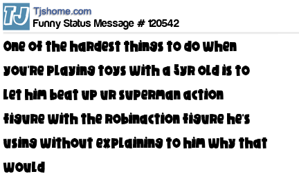 X One of the hardest things to do when you're playing toys with a 5yr old is to let him beat up ur superman action figure with the robinaction figure he's using without explaining to him why that would nevereverevereverfuckinghappen....ever