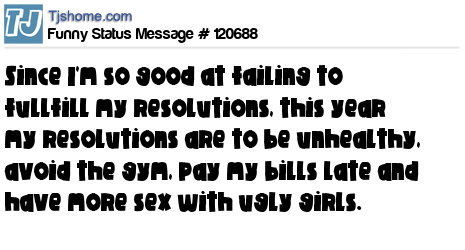 X Since I'm so good at failing to fullfill my resolutions, this year my resolutions are to be unhealthy, avoid the gym, pay my bills late and have more sex with ugly girls.