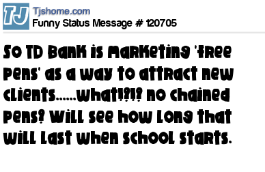 X So TD Bank is marketing 'free pens' as a way to attract new clients......what!?!? no chained pens? Will see how long that will last when school starts.