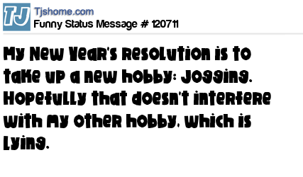 X My New Year's resolution is to take up a new hobby: Jogging. Hopefully that doesn't interfere with my other hobby, which is Lying.