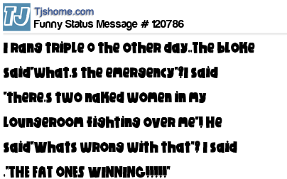 - # 76585 MAN: Hello! Is this 911? POLICE: Yes! What's Ur emergency??! MAN: Two girls are fighting over me! POLICE: What's wrong with that??! MAN: The ugly one is winning.... Hurry!!!