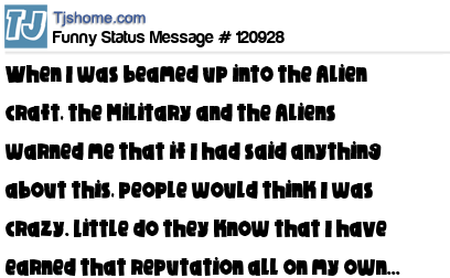 X When I was beamed up into the Alien craft, the Military and the Aliens warned me that if I had said anything about this, people would think I was crazy. Little do they know that I have earned that reputation all on my own...