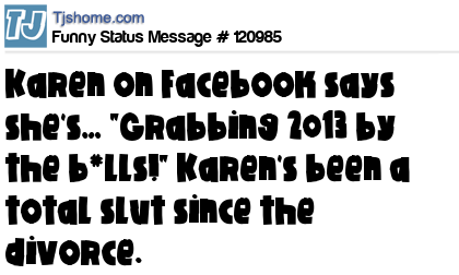 X says Karen on Facebook says she's… "Grabbing 2013 by the b*lls!" Karen's been a total slut since the divorce.