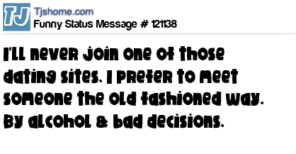 X says I'll never join one of those dating sites. I prefer to meet someone the old fashioned way. By alcohol & bad decisions.