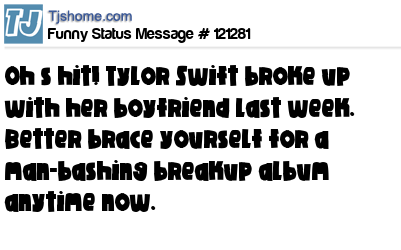 X says Oh s hit! Tylor Swift broke up with her boyfriend last week. Better brace yourself for a man-bashing breakup album anytime now.