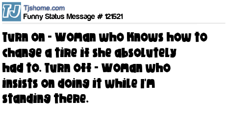 X says Turn on - Woman who knows how to change a tire if she absolutely had to. Turn off - Woman who insists on doing it while I'm standing there.