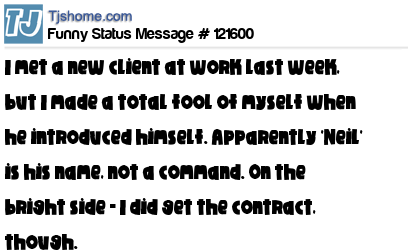 X I met a new client at work last week, but I made a total fool of myself when he introduced himself. Apparently 'Neil' is his name, not a command. On the bright side - I did get the contract, though.