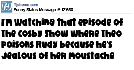 X I'm watching that episode of The Cosby Show where Theo poisons Rudy because he's jealous of her moustache