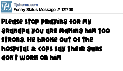 - # 132784 Please stop praying for my grandpa you are making him too strong. He broke out of the hospital & cops say their tasers don't work on him :(