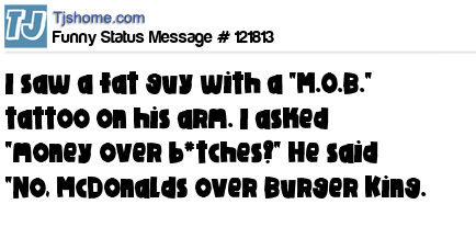 - # 99651 I saw a fat lady with a "M.O.B." tattoo on her arm. I asked "money over b*tches?" She said "No, McDonalds over Burger King.