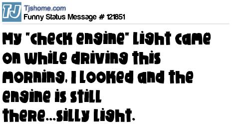 - # 63601 The other day my car's “Check Engine” light came on, so I popped the hood and looked, and the engine was still there. Silly light!
