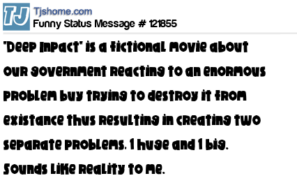 X says "Deep Inpact" is a fictional movie about our government reacting to an enormous problem buy trying to destroy it from existance thus resulting in creating two separate problems, 1 huge and 1 big. Sounds like reality to me.