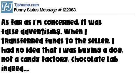 X As far as I'm concerned, it was false advertising. When I transferred funds to the seller, I had no idea that I was buying a dog, not a candy factory. Chocolate Lab indeed....