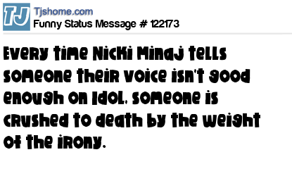 X is Every time Nicki Minaj tells someone their voice isn't good enough on Idol, someone is crushed to death by the weight of the irony.