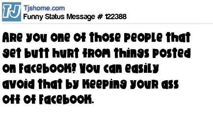 X Are you one of those people that get butt hurt from things posted on Facebook? You can easily avoid that by keeping your ass off of Facebook.