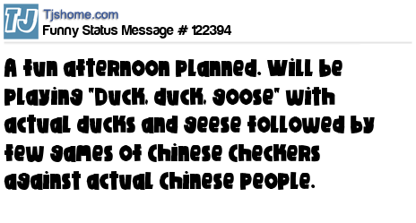 X has a fun afternoon planned. Will be playing "Duck, duck, goose" with actual ducks and geese followed by few games of Chinese Checkers against actual Chinese people.