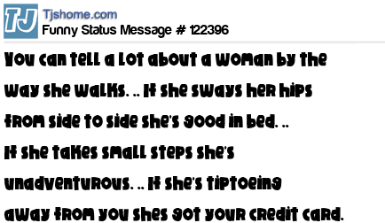 - # 183154 You can tell a lot about a woman by the way she walks...... If she sways her hips from side to side she's good in bed. .. If she takes small steps she's unadventurous. .. If she's tiptoeing away from you shes got your credit card