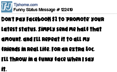 X Don't pay Facebook $2 to 'promote' your latest status. Simply send me half that amount, and I'll repeat it to all my friends in real life. For an extra 50c, I'll throw in a funny face when I say it.