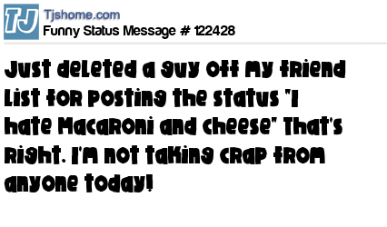X Just deleted a guy off my friend list for posting the status "I hate Macaroni and cheese" That's right. I'm not taking crap from anyone today!