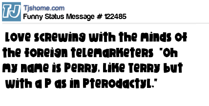 X love screwing with the minds of the foreign telemarketers "Oh my name is Perry, like Terry but with a P as in Pterodactyl."