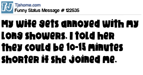 X says My wife gets annoyed with my long showers. I told her they could be 10-15 minutes shorter if she joined me.