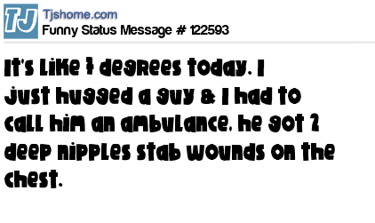 X is It's like 7 degrees today. I just hugged a guy & I had to call him an ambulance, he got 2 deep nipples stab wounds on the chest.