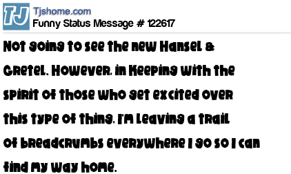 X is Not going to see the new Hansel & Gretel. However, in keeping with the spirit of those who get excited over this type of thing, I'm leaving a trail of breadcrumbs everywhere I go so I can find my way home.