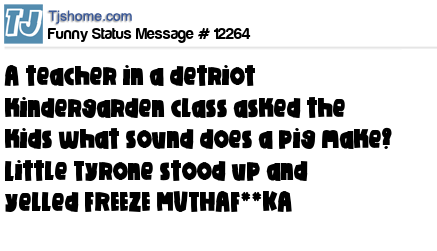 X A teacher in a detriot kindergarden class asked the kids what sound does a pig make? Little Tyrone stood up and yelled FREEZE MUTHAF**KA