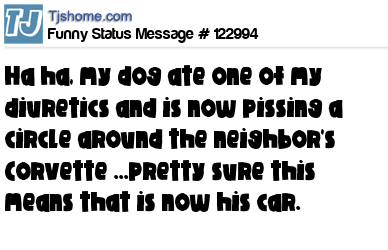 X says Ha ha, my dog ate one of my diuretics and is now pissing a circle around the neighbor's Corvette ...pretty sure this means that is now his car.