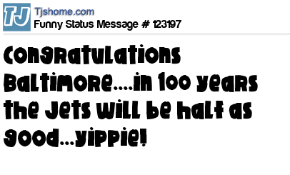 X is Congratulations Baltimore....in 100 years the Jets will be half as good...yippie!