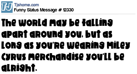 X says the world may be falling apart around you, but as long as you're wearing Miley Cyrus merchandise you'll be alright.