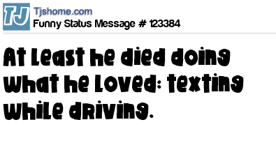 - # 168604 5 Word Eulogy: He loved texting and driving.