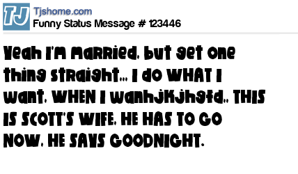 X Yeah I'm married, but get one thing straight,,, I do WHAT I want, WHEN I wanhjkjhgfd,, THIS IS SCOTT'S WIFE, HE HAS TO GO NOW, HE SAYS GOODNIGHT.