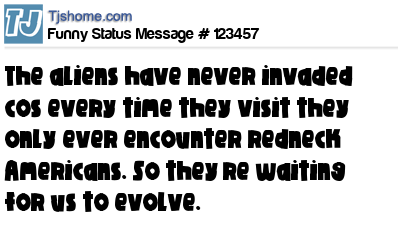 X says The aliens have never invaded cos every time they visit they only ever encounter redneck Americans. So they’re waiting for us to evolve.