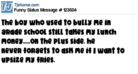 X The boy who used to bully me in grade school still takes my lunch money,,,,,,on the plus side, he never forgets to ask me if I want to upsize my fries.