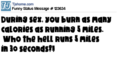- # 148112 I read today that when you have sex, you burn as many calories as running five miles. Who the hell runs five miles in two minutes??!!