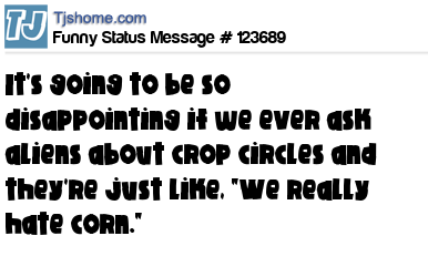 - # 123650 Wouldn't it be so disappointing if we ever come into contact with aliens, and we ask them about the mysteriousness & complexity of crop circles and they're like "Dude, we just really hate corn."