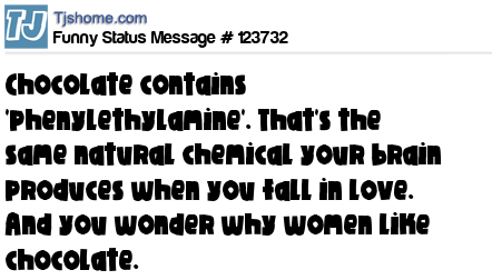 X  Chocolate contains 'phenylethylamine'. That's the same natural chemical your brain produces when you fall in love. And you wonder why women like chocolate.