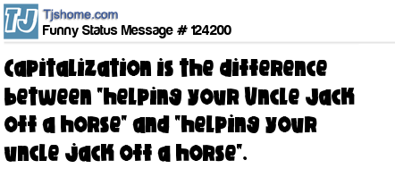 - # 22210 cannot stress enough that grammar is important: Capitalisation is the difference between helping your Uncle Jack off a horse & helping your uncle jack off a horse