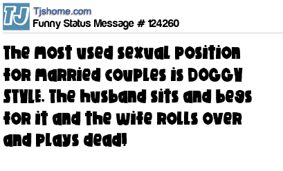 - # 19180 -- The most used sexual position for married couples is the doggie position... The husband sits and begs for it while the wife rolls over and plays dead.