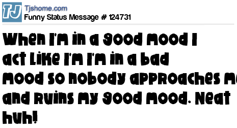 - # 178767 When I'm in a good mood I act like I'm I'm in a bad mood so nobody approaches me and ruins my good mood.