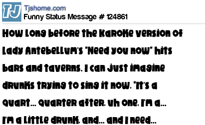 X  How long before the Karoke version of Lady Antebellum's "Need you now" hits bars and taverns. I can just imagine drunks trying to sing it now, "It's a quart... quarter after, uh one, I'm a... I'm a little drunk, and... and I need... you now."