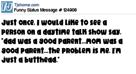 - # 124887 Just once, I would like to see a person on a daytime talk show say, "dad was a good parent...mom was a good parent...the problem is me, I'm just a sheethead."