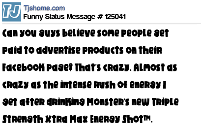 X Can you guys believe some people get paid to advertise products on their Facebook page? That's crazy. Almost as crazy as the intense rush of energy I get after drinking Monster's new Triple Strength Xtra Max Energy Shot™.