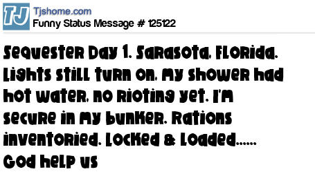 X says Sequester Day 1. Sarasota, Florida. Lights still turn on, my shower had hot water, no rioting yet. I'm secure in my bunker. Rations inventoried. Locked & loaded...... God help us