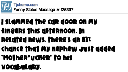 X says I slammed the car door on my fingers this afternoon. In related news, there's an 83% chance that my nephew just added "Mother*ucker" to his vocabulary.