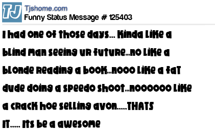 X is I had one of those days... kinda like a blind man seeing ur future,,,no like a blonde reading a book,,,nooo like a faT dude doing a speedo shoot,,,noooooo like a crack hoe selling avon.....THATS IT..... Its be a awesome day>>>>>>>